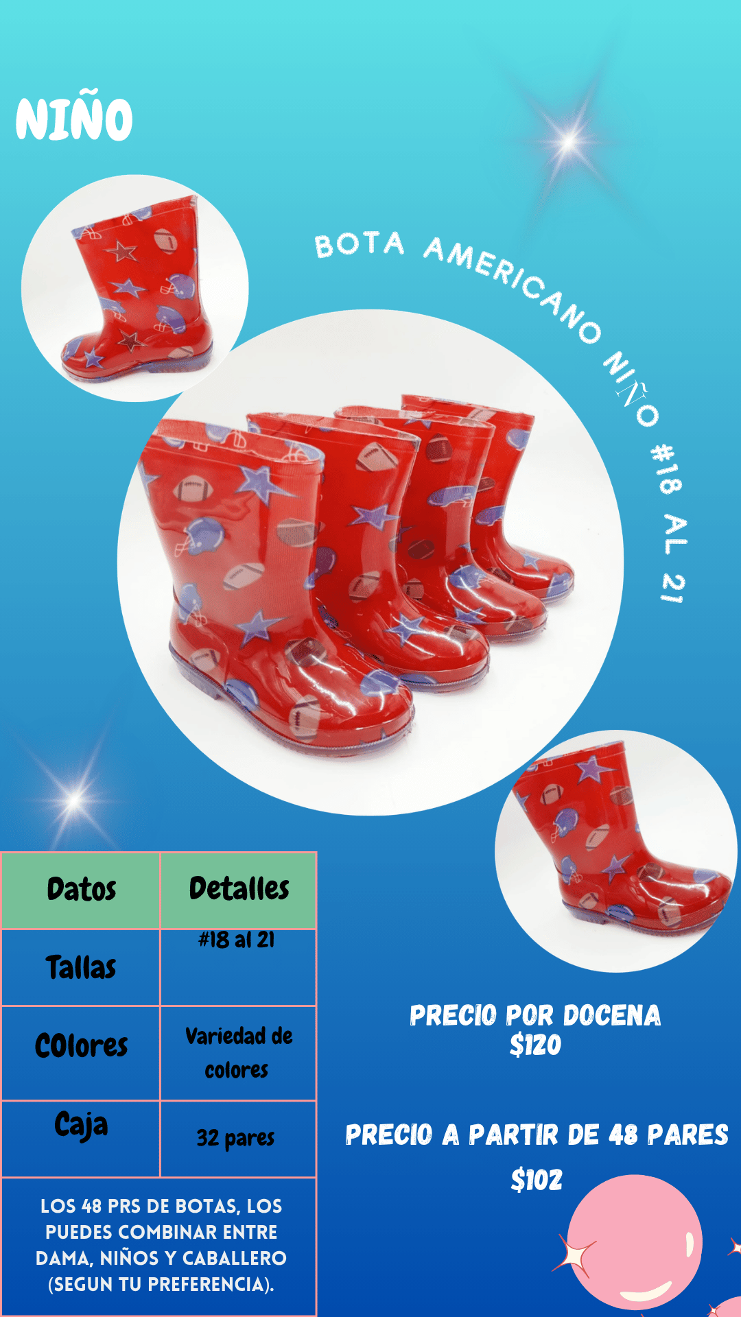 Bota americano niño. Tallas 18 al 21, paquete de 32 pares.