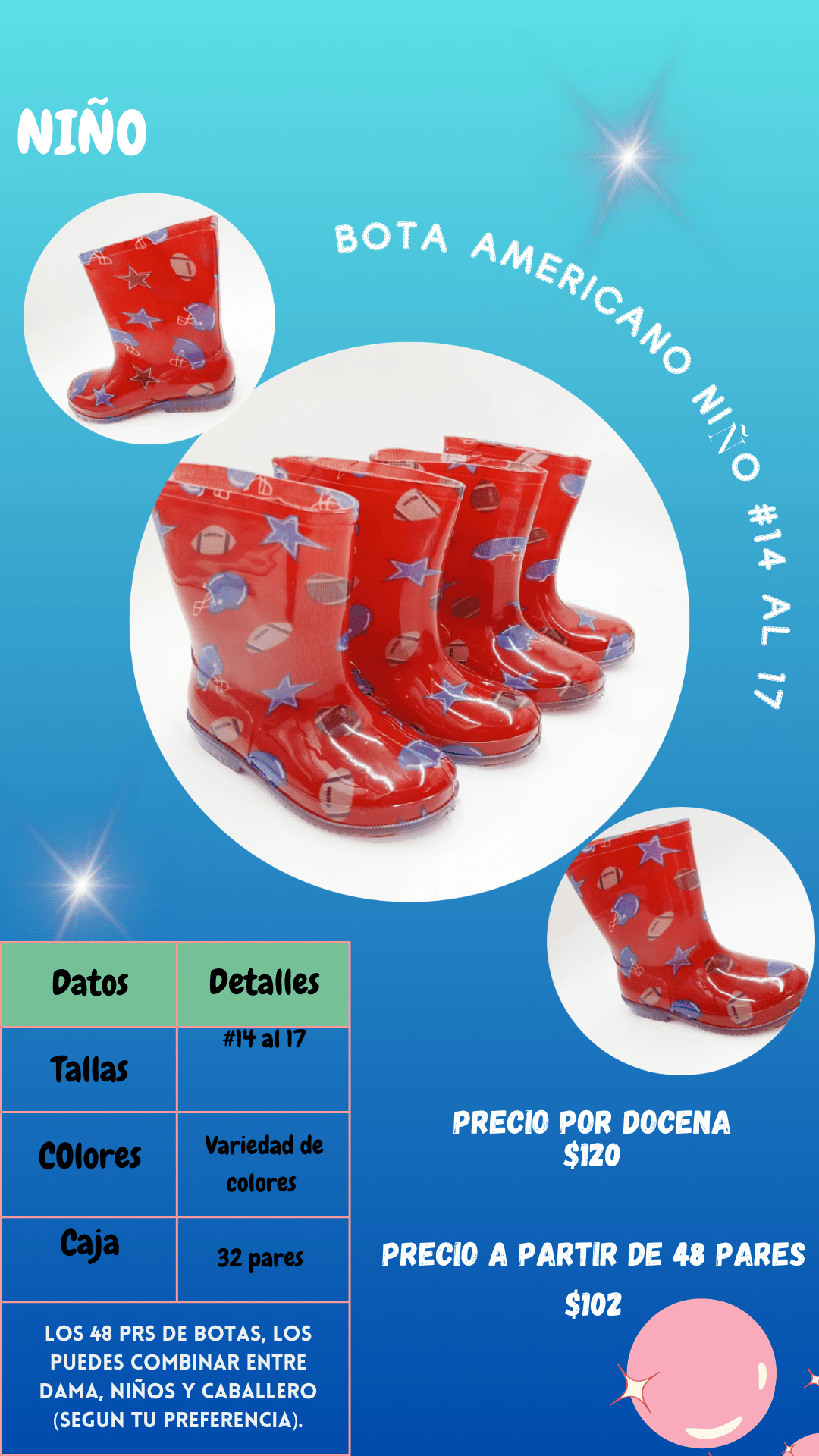 Bota americano niño. Tallas 14 al 17, paquete de 32 pares.