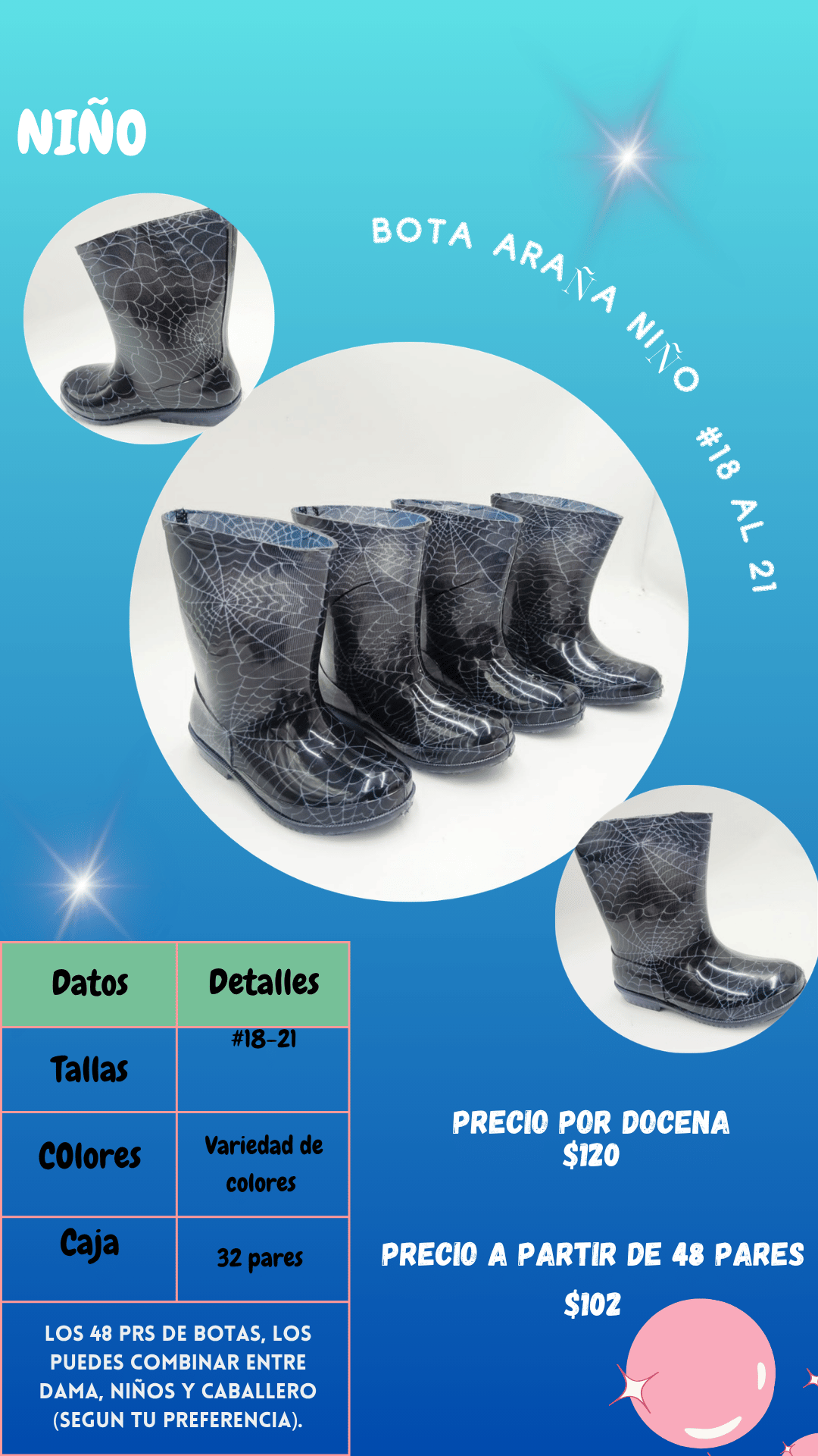 Bota araña niño. Tallas 18 al 21, paquete de 32 pares.