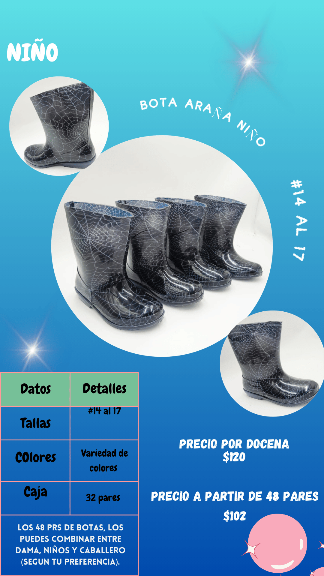 Bota araña niño. Tallas 14 al 17, paquete de 32 pares.