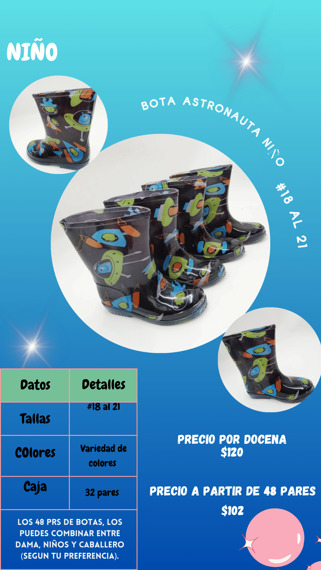 Bota astronauta niño. Tallas 18 al 21, paquete de 32 pares.
