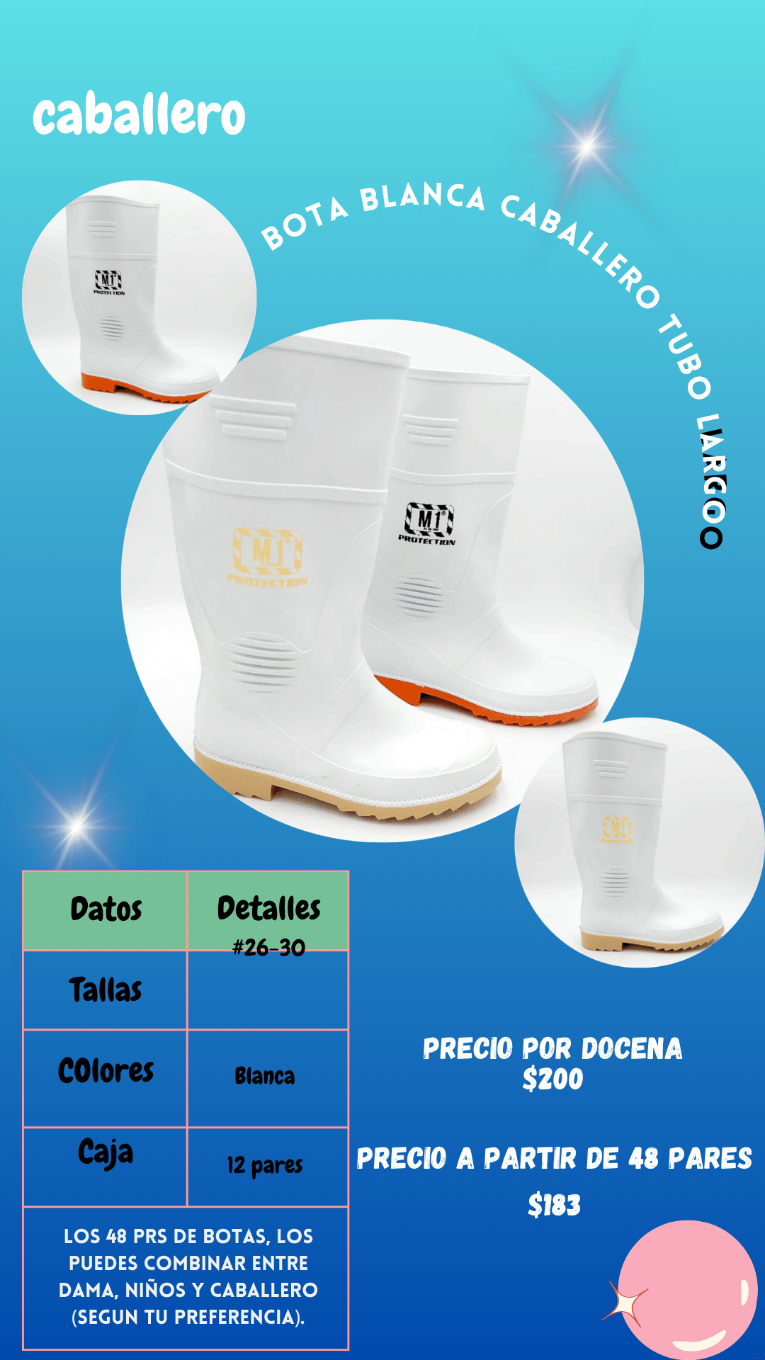 Bota blanca tubo largo caballero. Tallas 26 al 30, paquete de 48 pares.