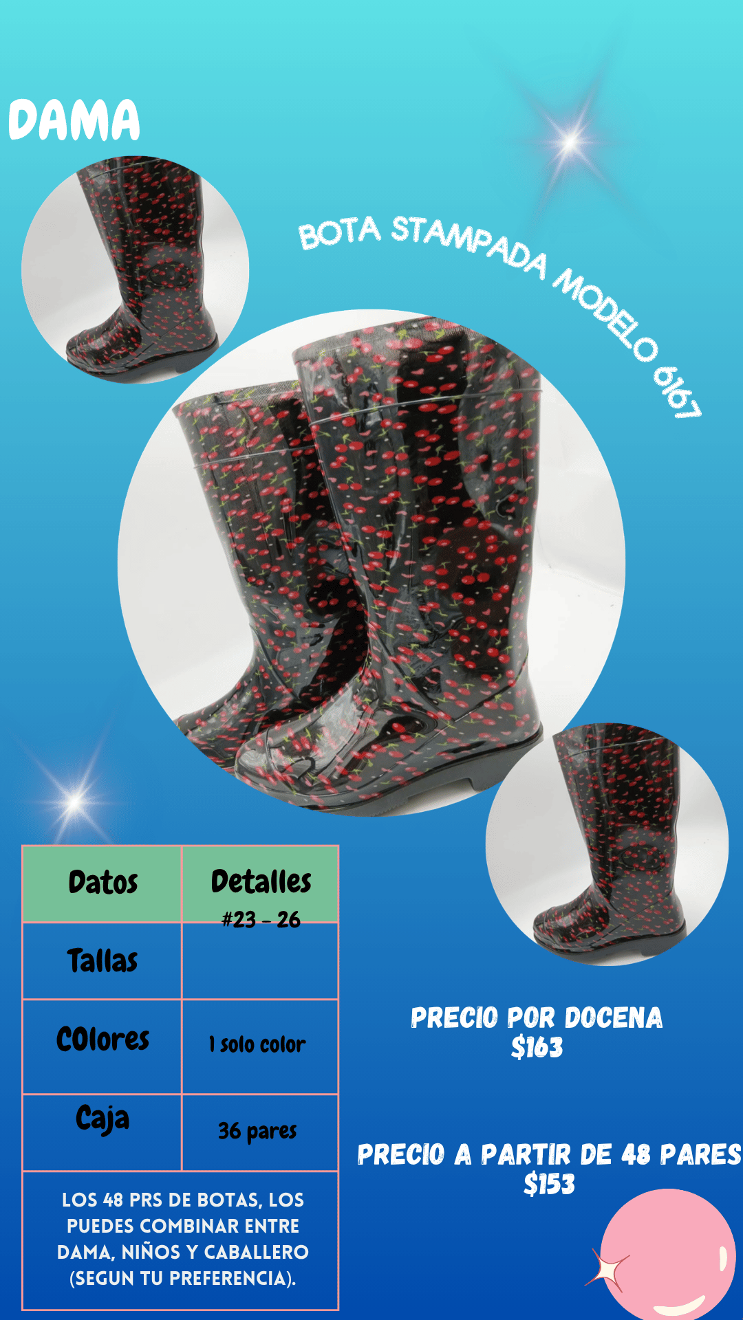 Bota estampada 6167 dama. Tallas 23 al 33, paquete de 36 pares.