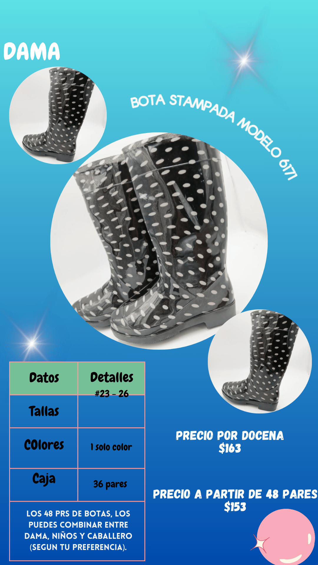 Bota estampada 6171 dama. Tallas 23 al 33, paquete de 36 pares.