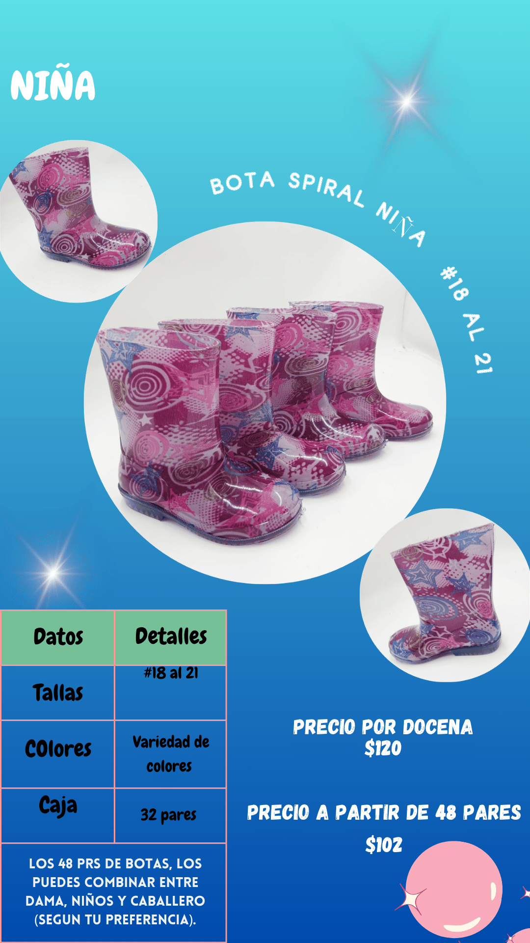 Bota estampada espiral niña. Tallas 18 al 21, paquete de 32 pares.