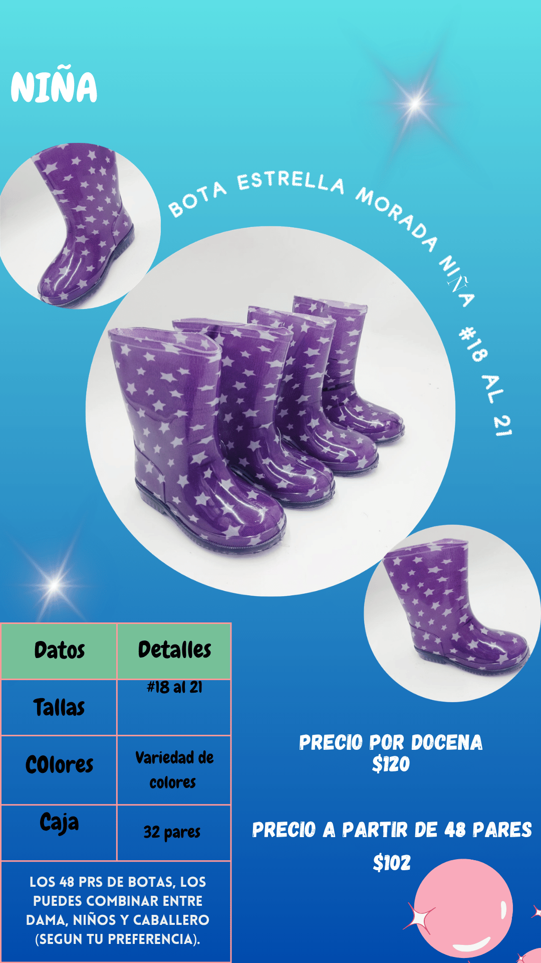 Bota estampada estrella niña. Tallas 18 al 21, paquete de 32 pares.