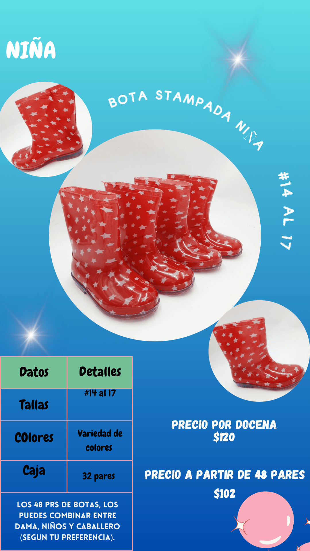 Bota estampada niña. Tallas 14 al 17, paquete de 32 pares.