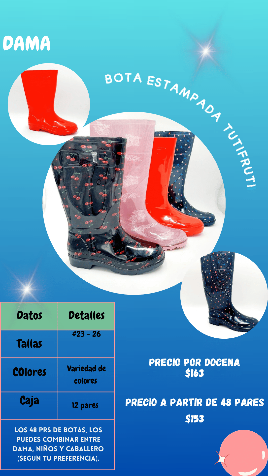 Bota estampada tutifruti dama. Tallas 23 al 26, paquete de 48 pares.