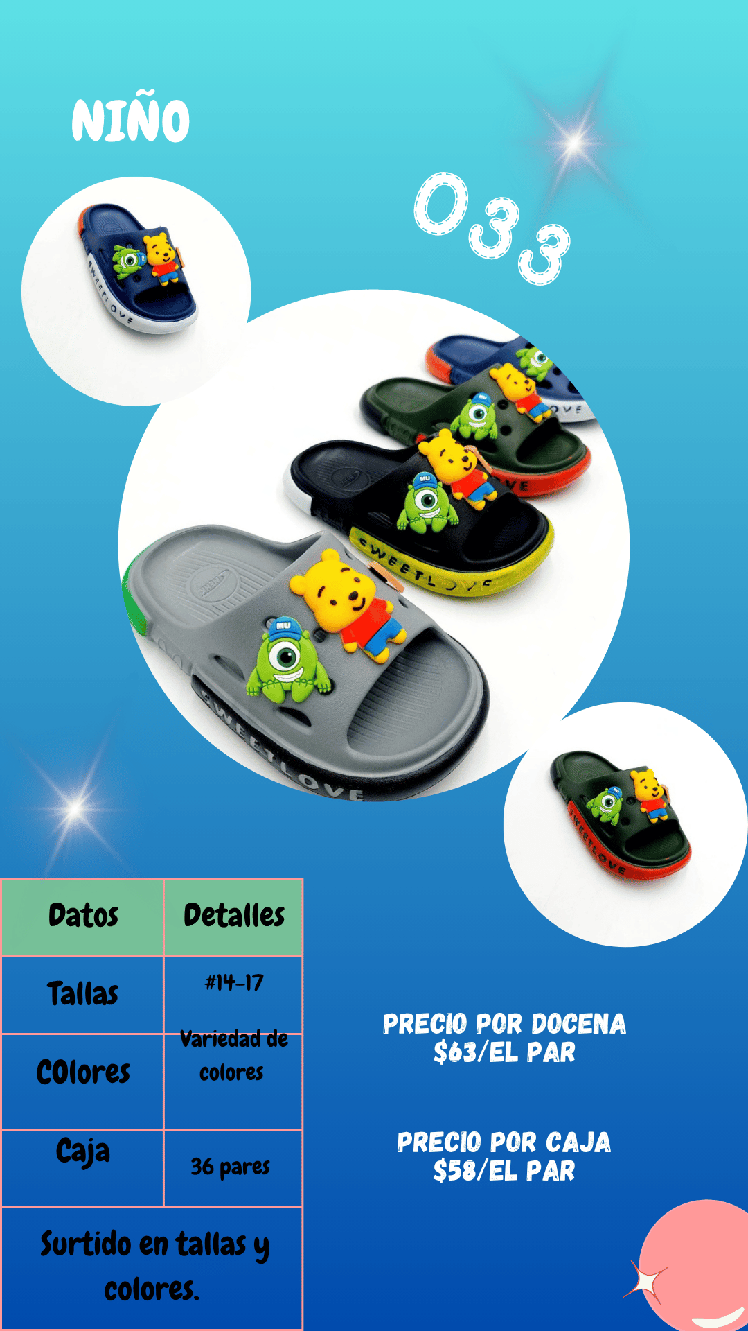 Sandalia 033 niño. Tallas 14 al 17, paquete de 36 pares.