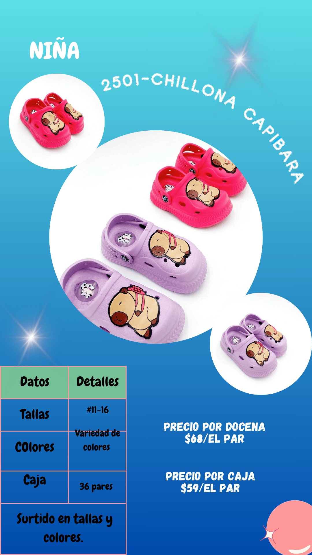 Sandalia 2501 chillona capibara niña. Tallas 11 al 16, paquete de 36 pares.