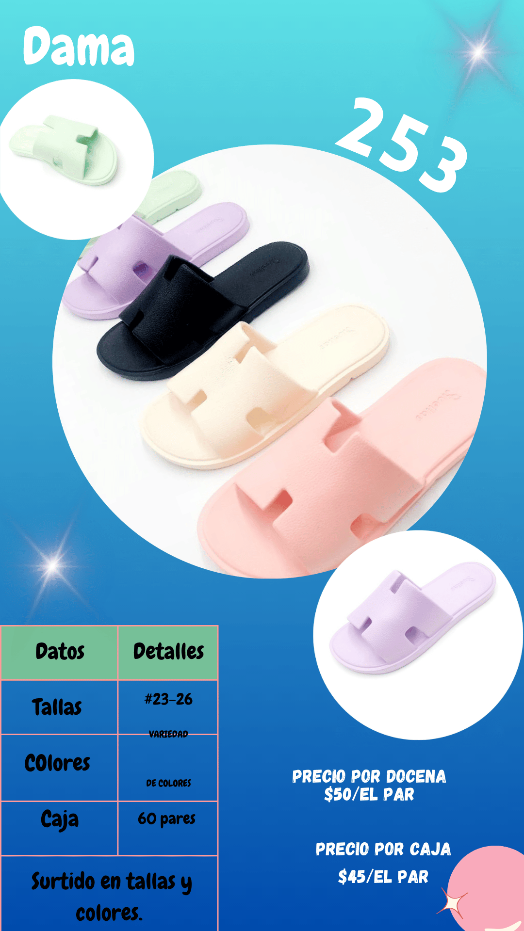 Sandalia 253 dama. Tallas 23 al 26, paquete de 60 pares.