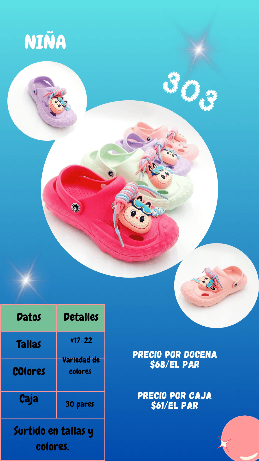 Sandalia 303 niña. Tallas 17 al 22, paquete de 30 pares.
