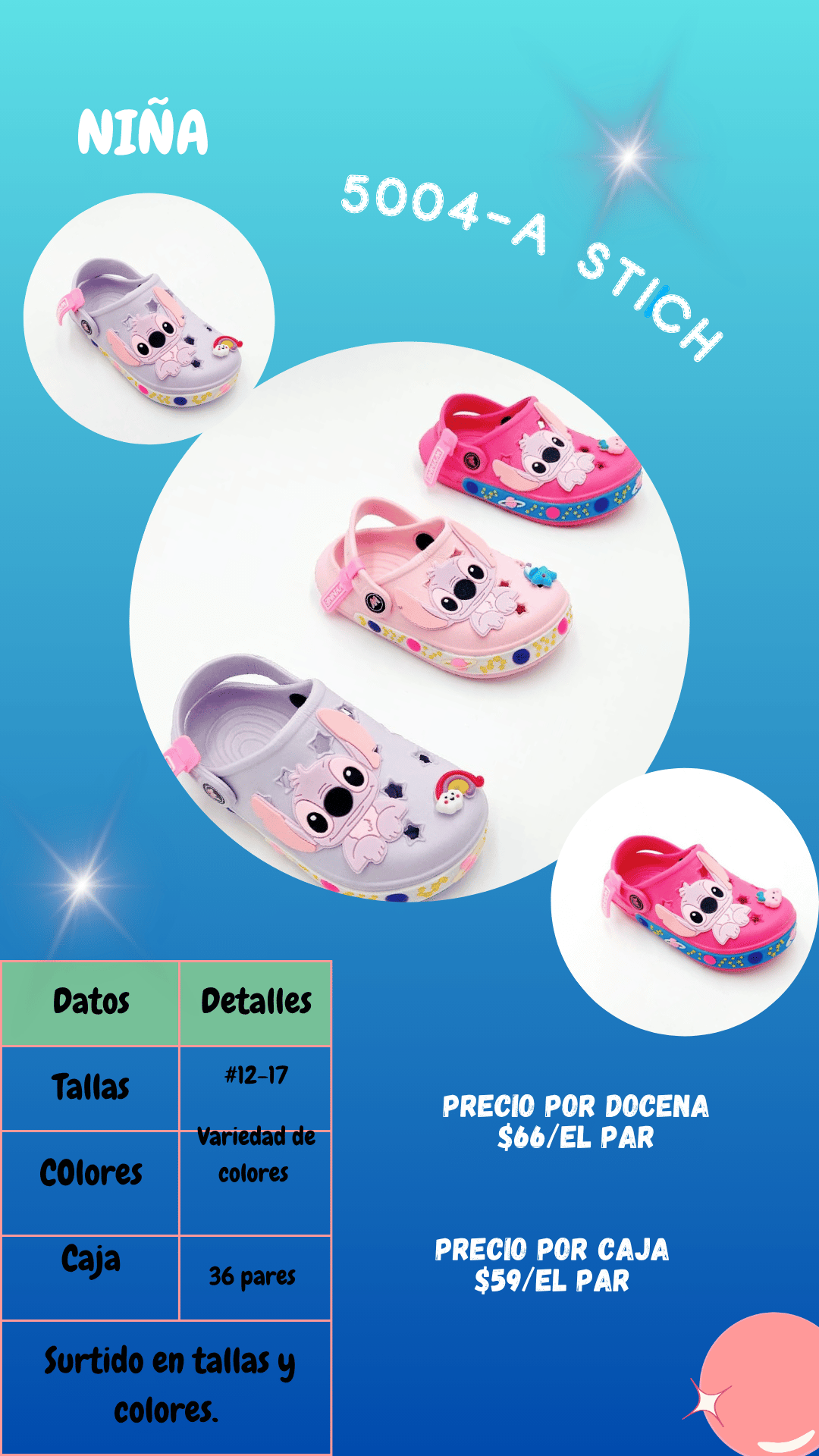 Sandalia 5004A Stitch niña. Tallas 12 al 17, paquete de 36 pares.