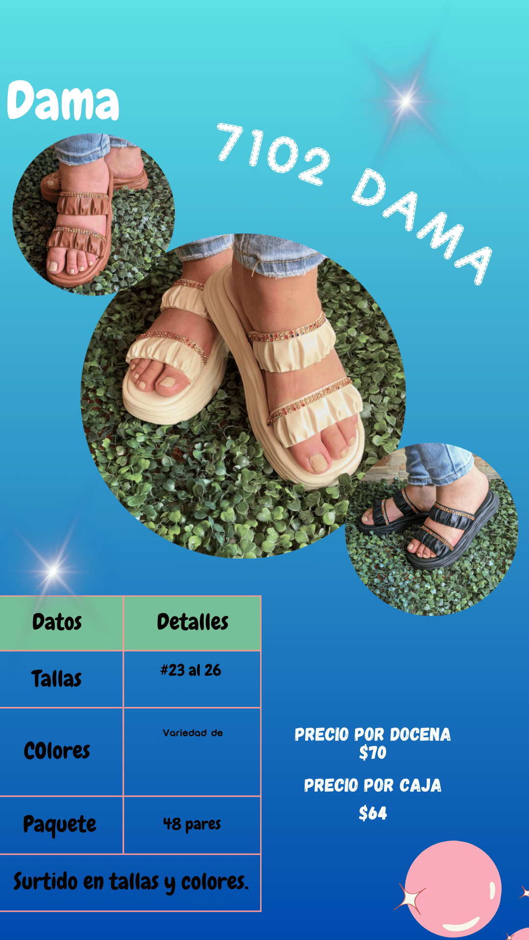 Sandalia 7102 dama. Tallas 23 al 26, paquete de 48 pares.