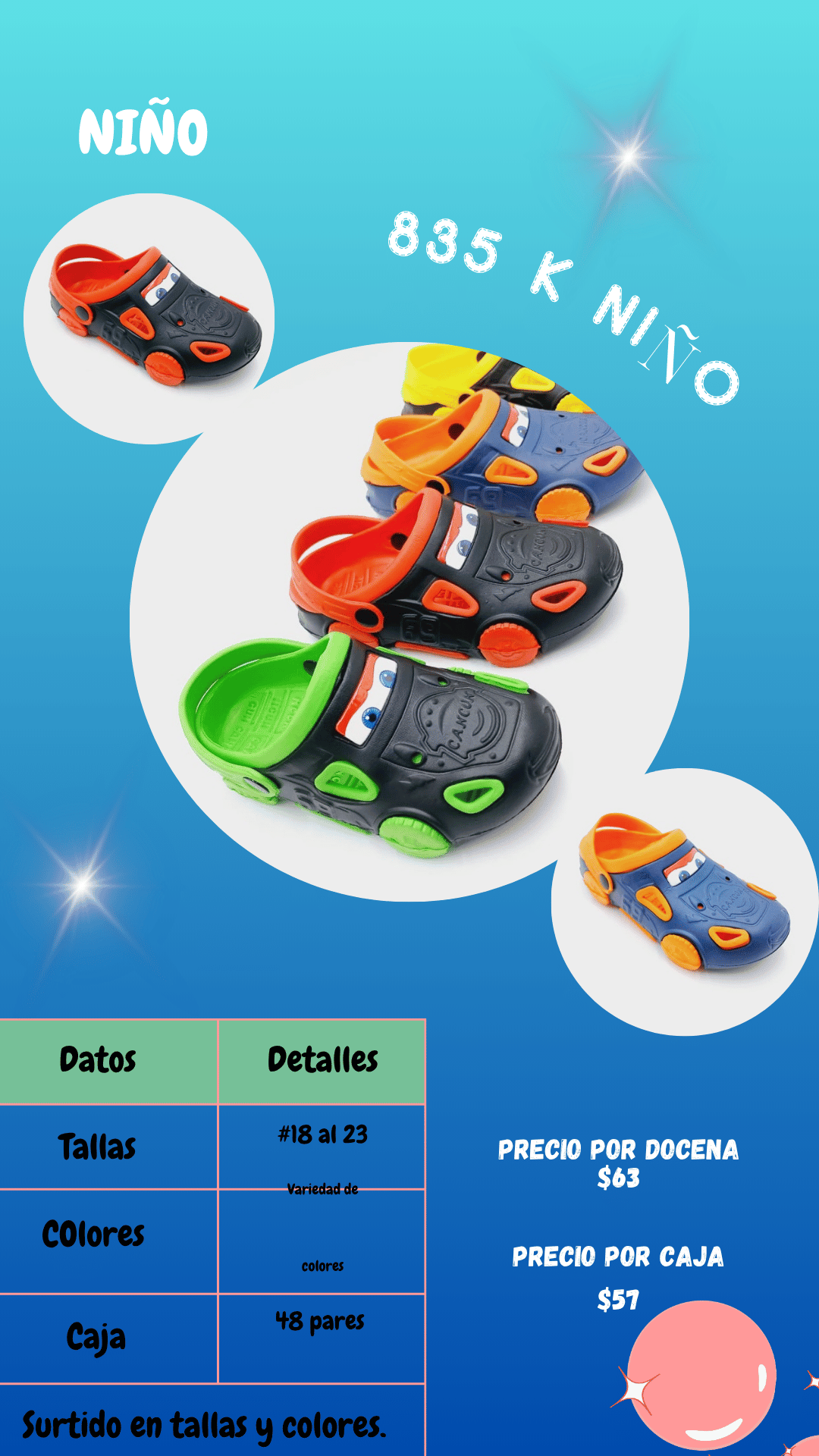Sandalia 835 IO niño. Tallas 11 al 17, paquete de 48 pares.
