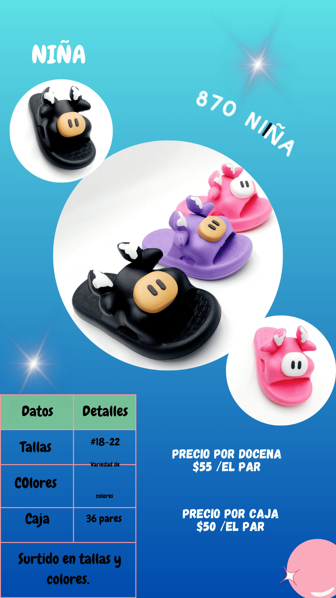 Sandalia 870 niña. Tallas 18 al 22, paquete de 36 pares.