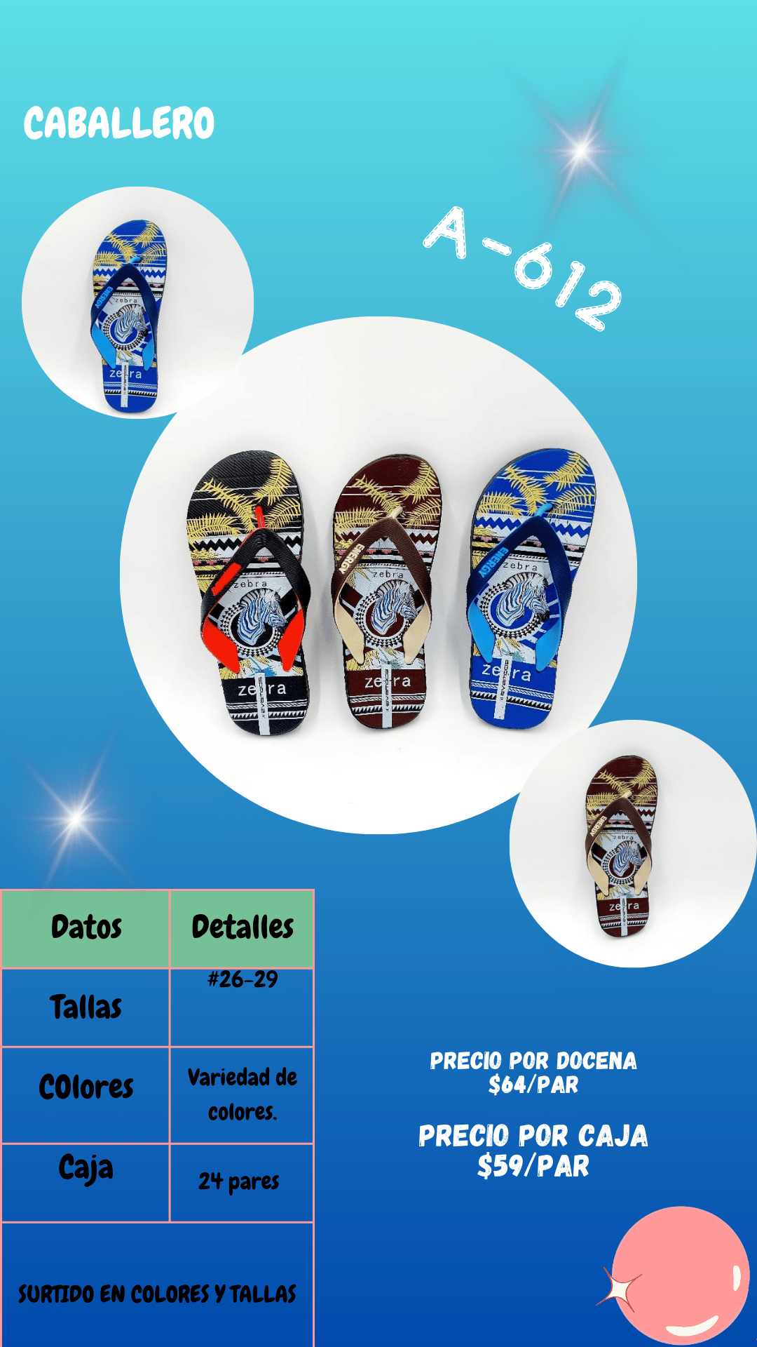 Sandalia A612 caballero. Tallas 26 al 29, paquete de 48 pares.