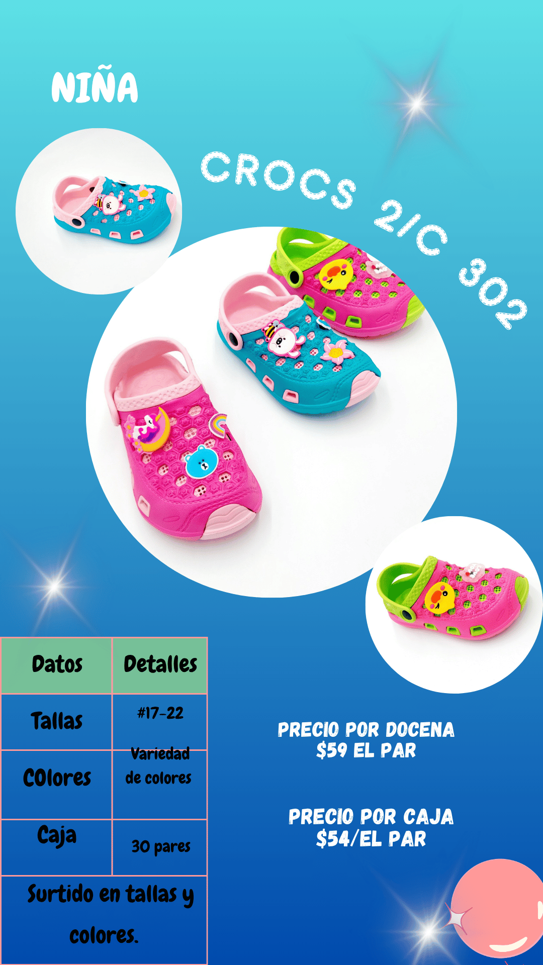 Sandalia Crocs 302 niña. Tallas 17 al 22, paquete de 30 pares.
