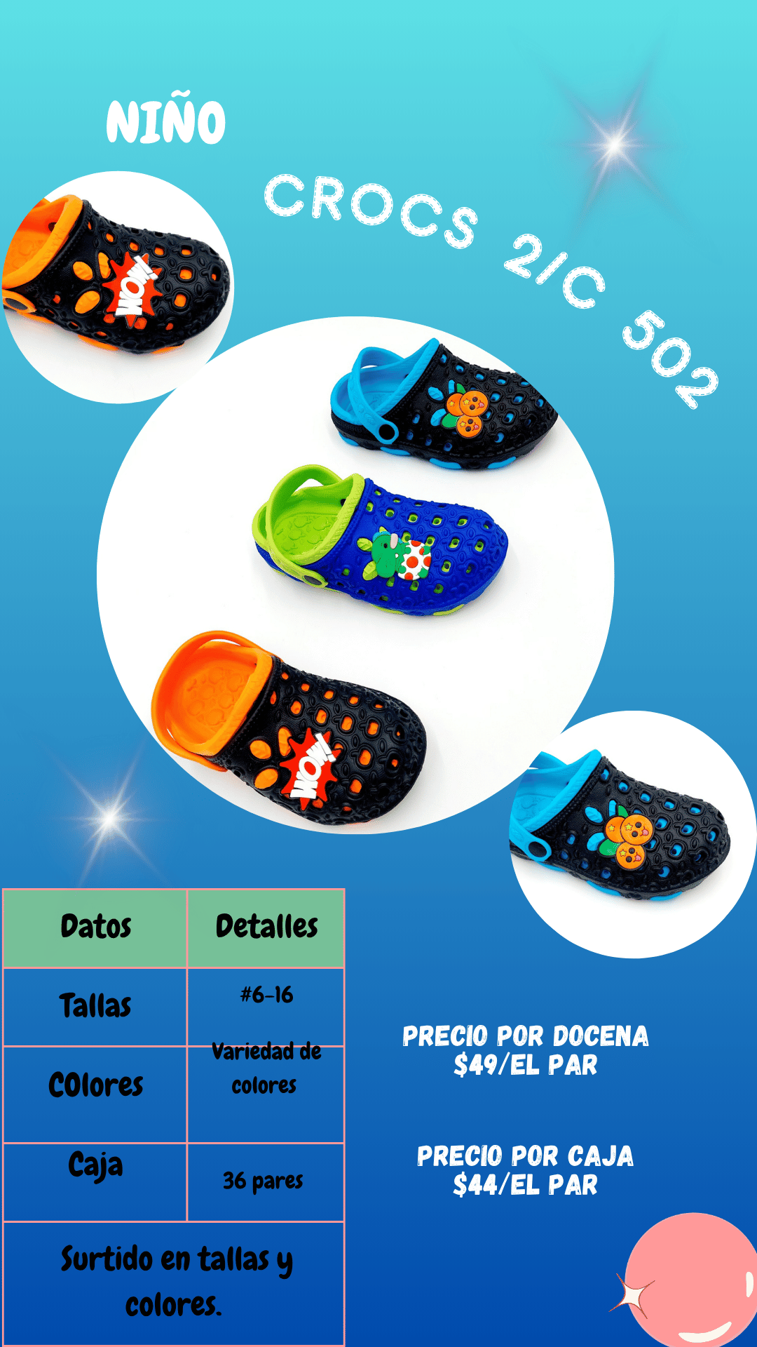 Sandalia Crocs 502 niño. Tallas 6 al 16, paquete de 36 pares.