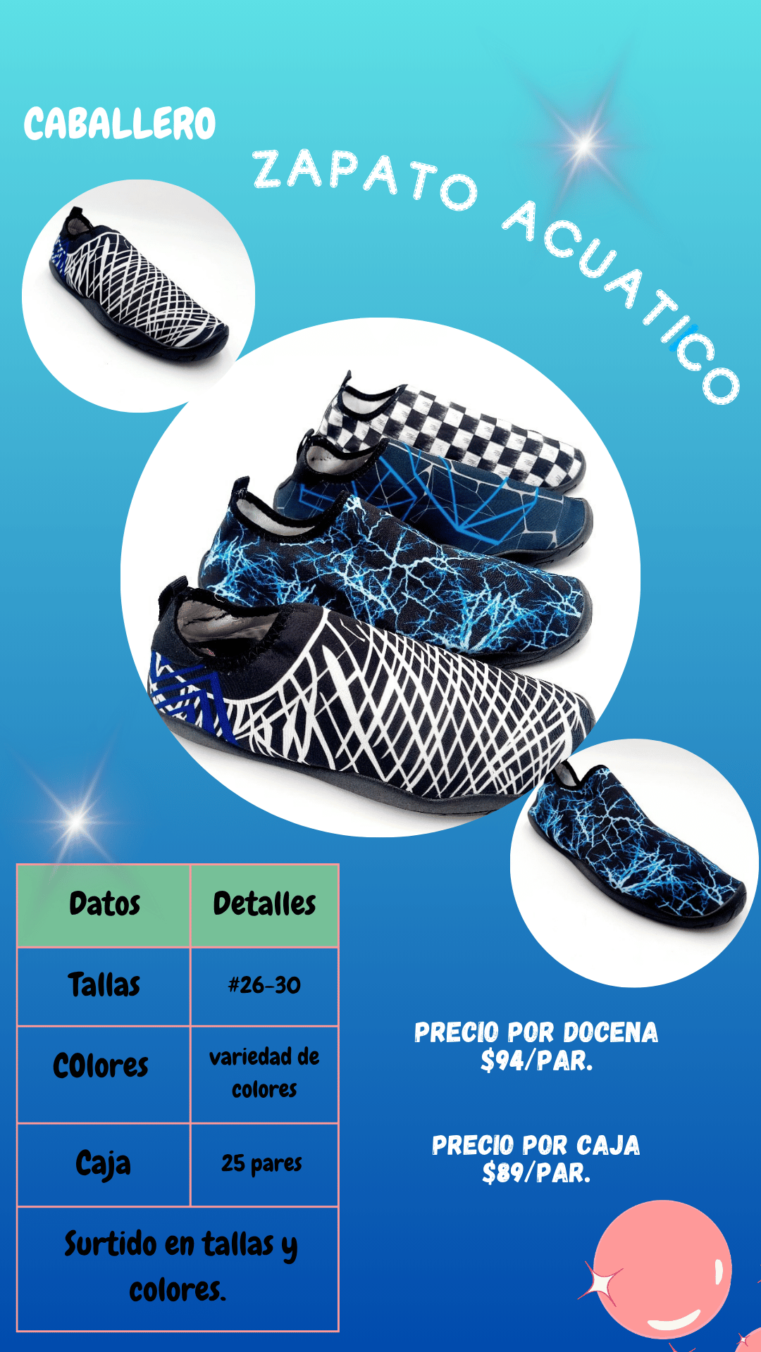 Sandalia Zapato acuático caballero. Tallas 26 al 30, paquete de 25 pares.