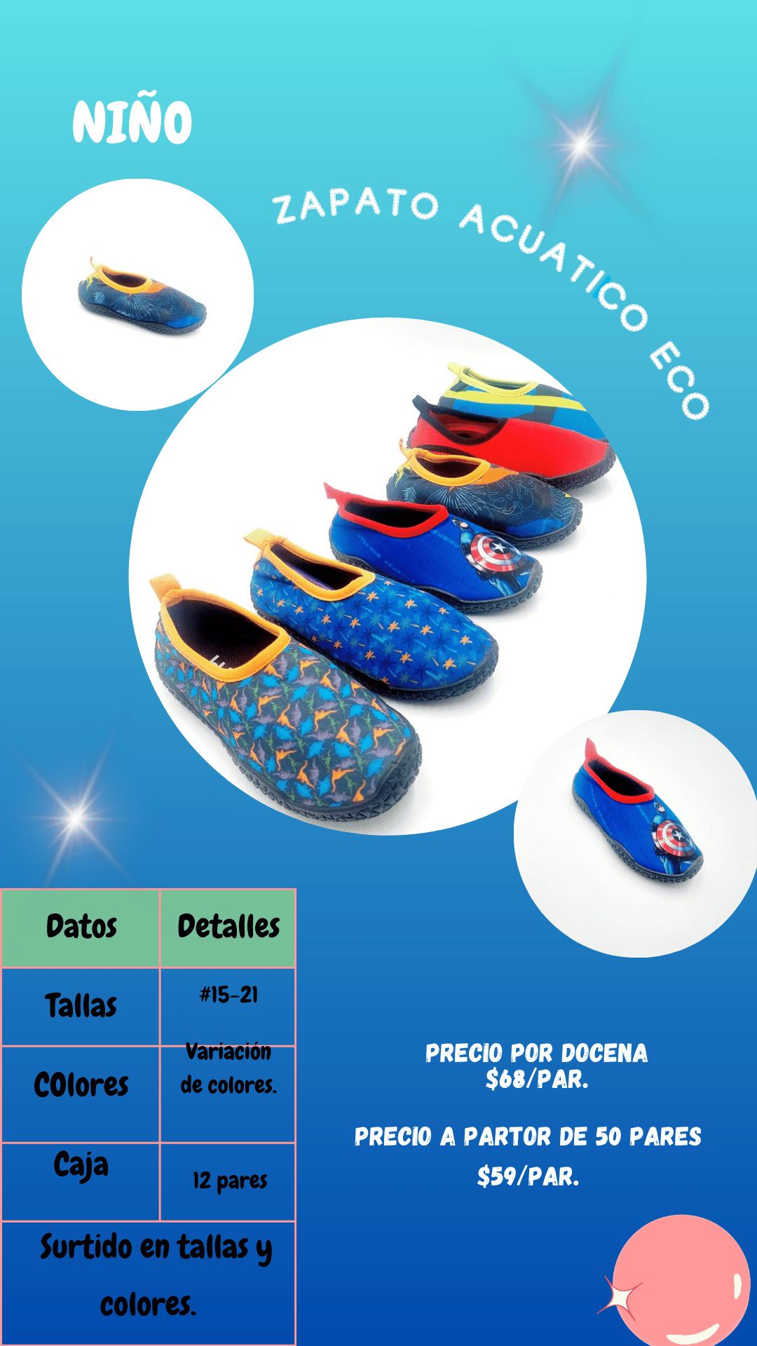 Sandalia Zapato acuático eco niño. Tallas 15 al 21, paquete de 12 pares.