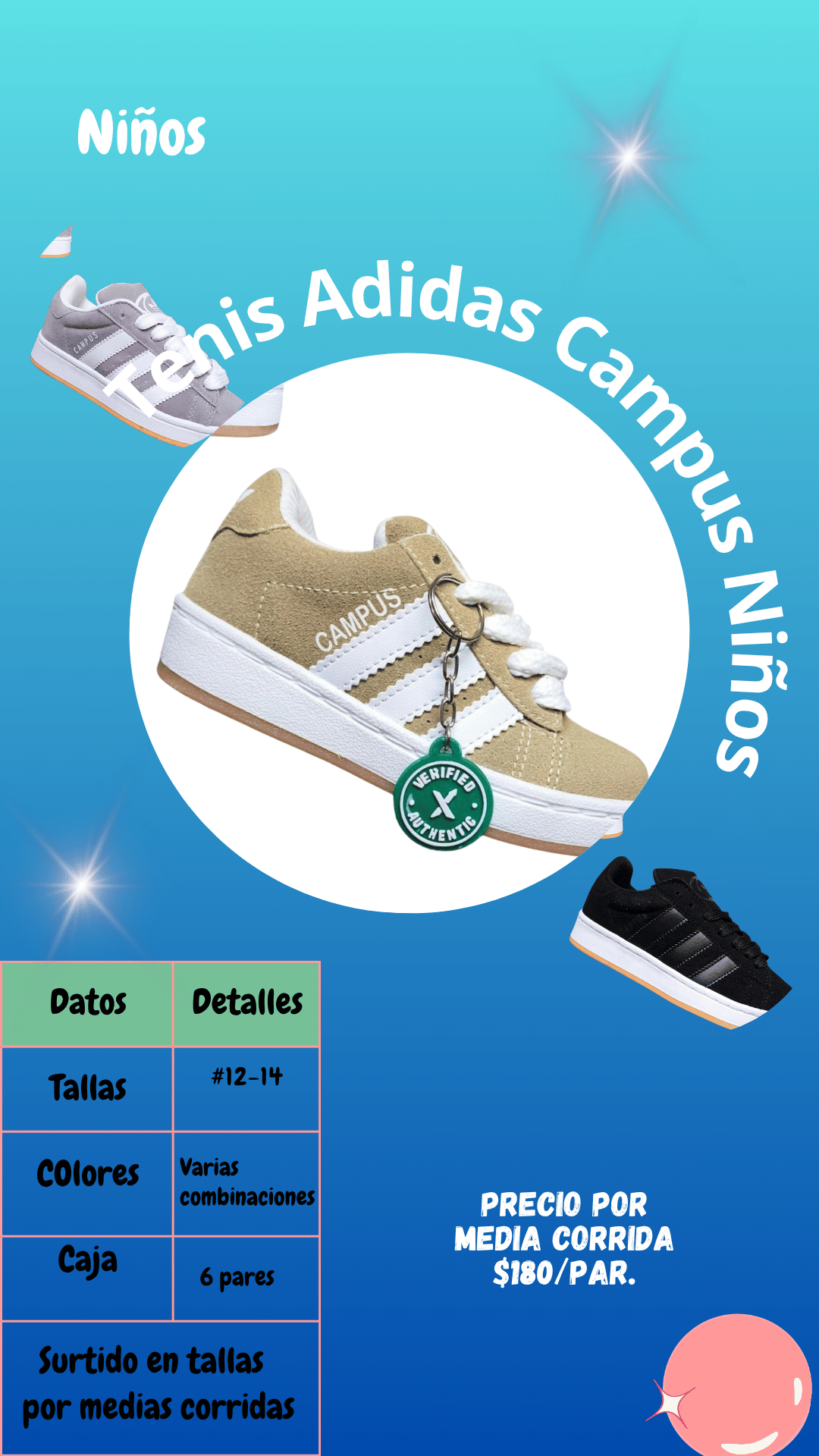 Tenis Adidas campus bebés. Tallas 12 al 14, paquete de 6 pares.