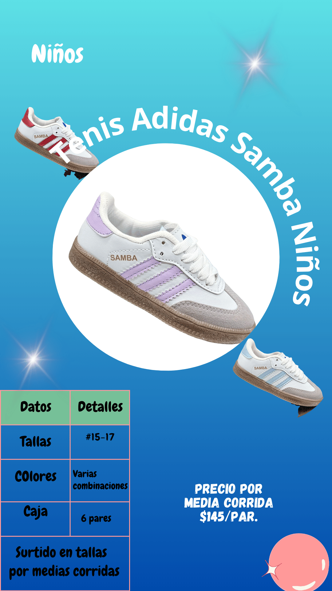 Tenis Adidas Samba niños. Tallas 15 al 17, paquete de 6 pares.