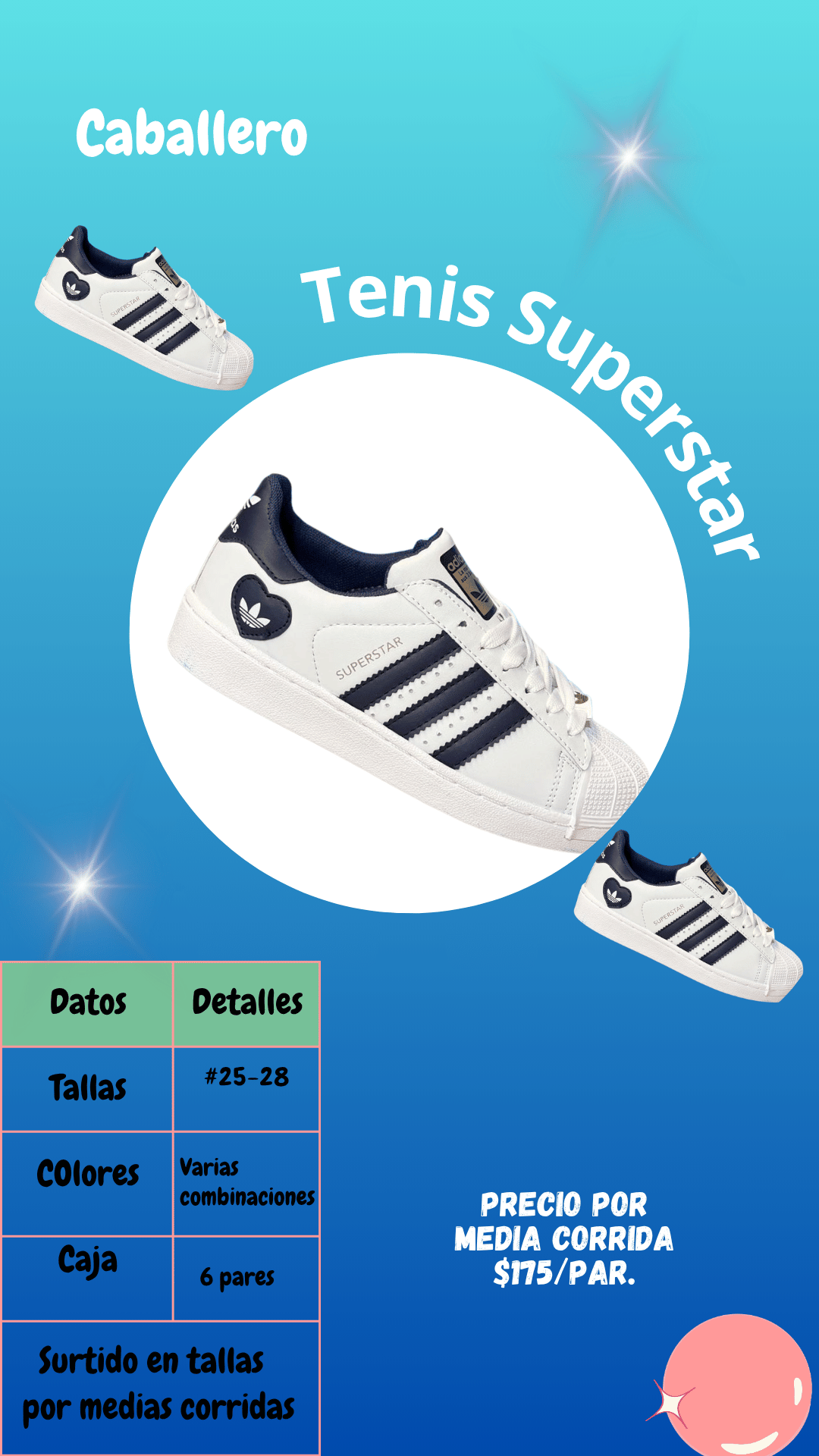 Tenis Adidas Superstar caballero. Tallas 25 al 28, paquete de 6 pares.