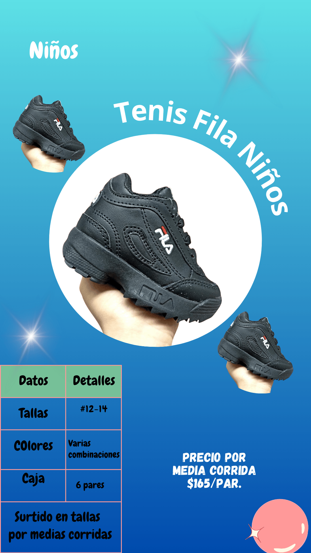 Tenis Fila niños. Tallas 12 al 14, paquete de 6 pares.