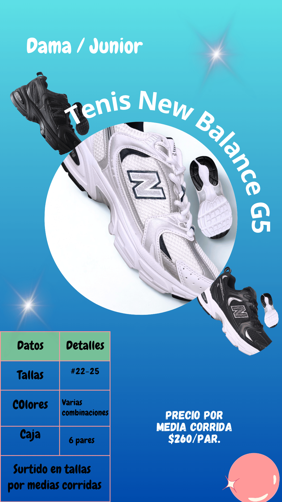 Tenis New Balance G5 Junior y dama. Tallas 23 al 26, paquete de 6 pares.