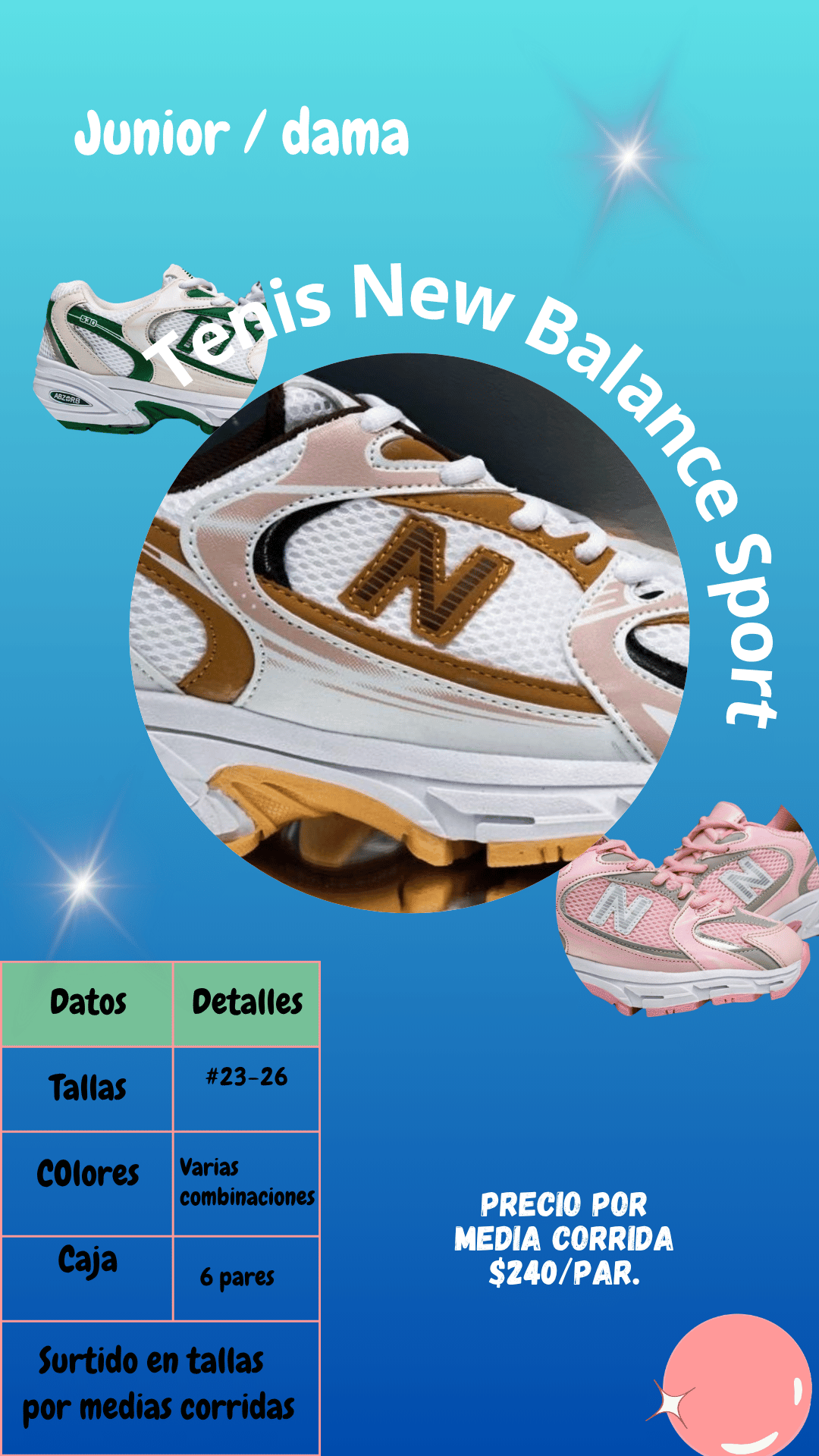 Tenis New Balance Sport Junior y dama. Tallas 23 al 26, paquete de 6 pares.