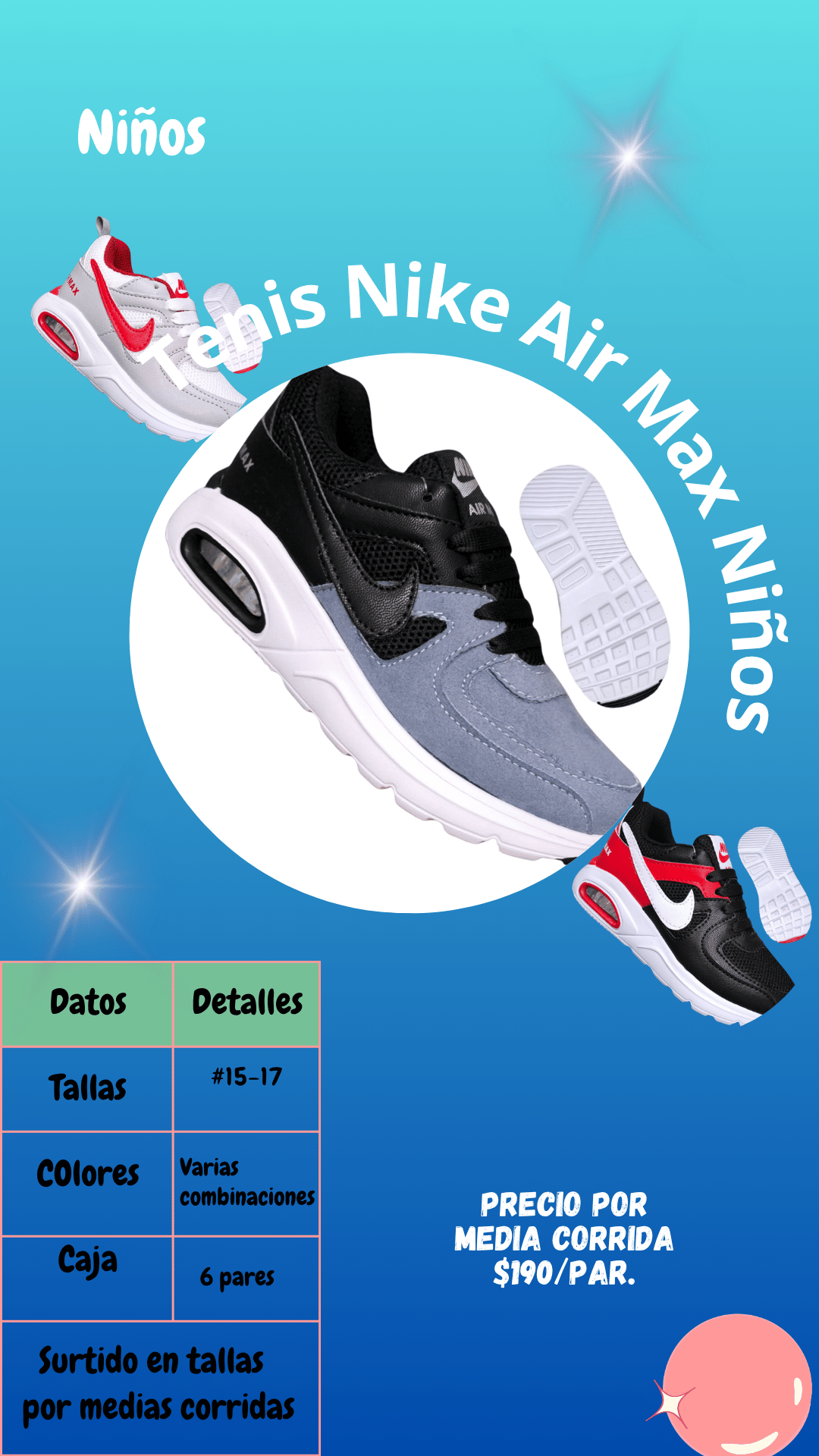 Tenis Nike Air Max niños. Tallas 15 al 17, paquete de 6 pares.