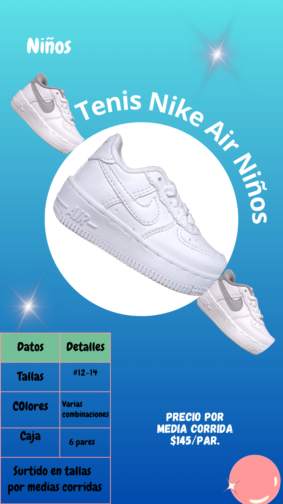 Tenis Nike Air niños. Tallas 12 al 14, paquete de 6 pares.