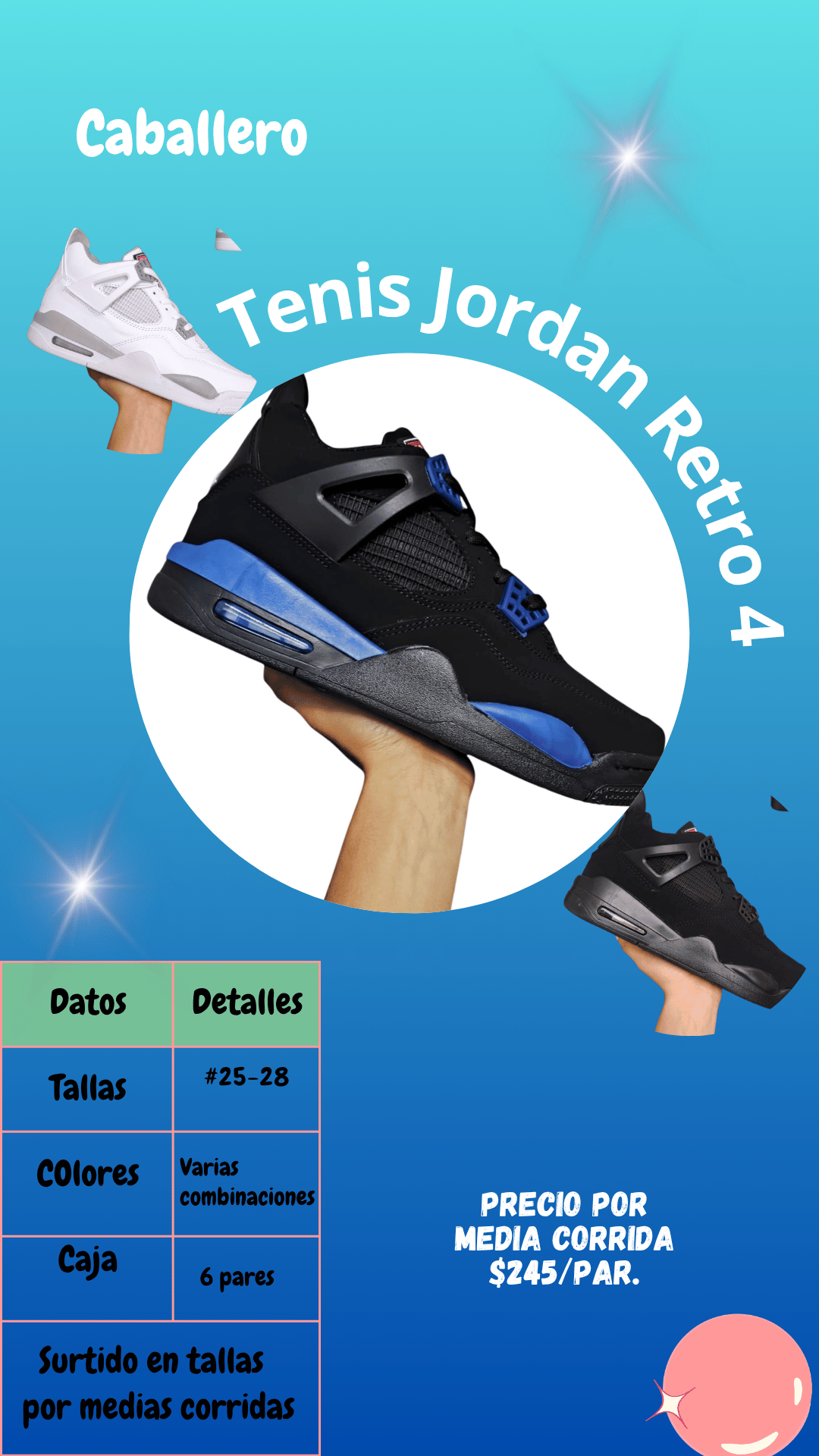 Tenis Nike Jordan Retro 4 caballero. Tallas 25 al 28, paquete de 6 pares.