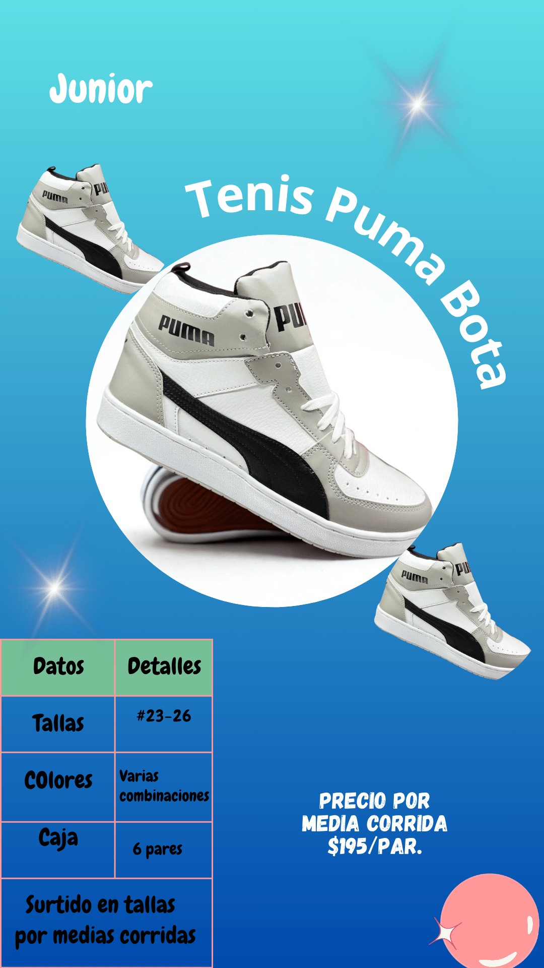 Tenis Puma bota Junior. Tallas 23 al 26, paquete de 6 pares.