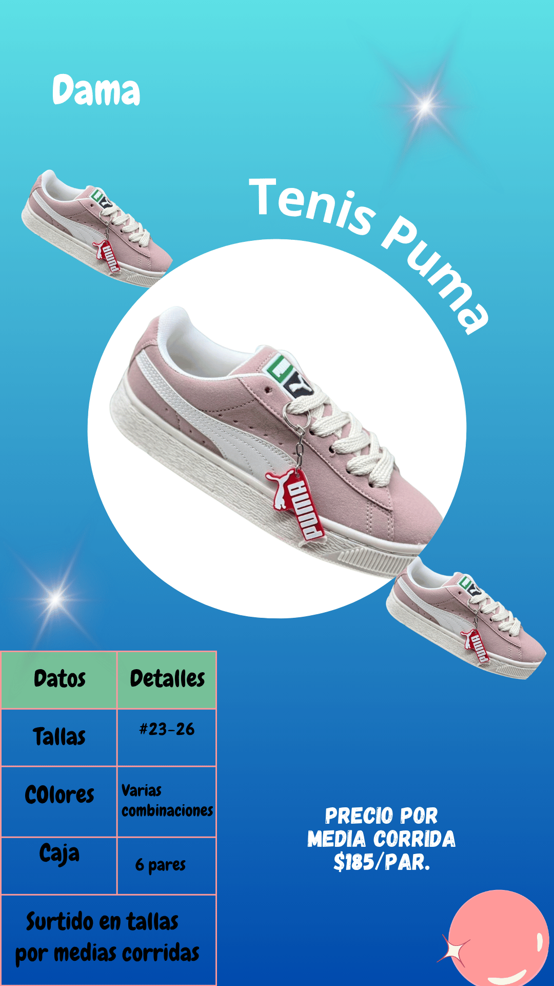 Tenis Puma carnaza dama. Tallas 23 al 26, paquete de 6 pares.