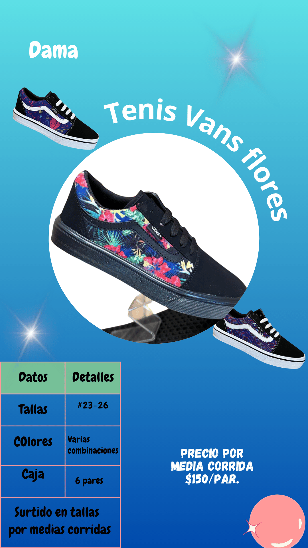 Tenis Vans flores dama. Tallas 23 al 26, paquete de 6 pares.