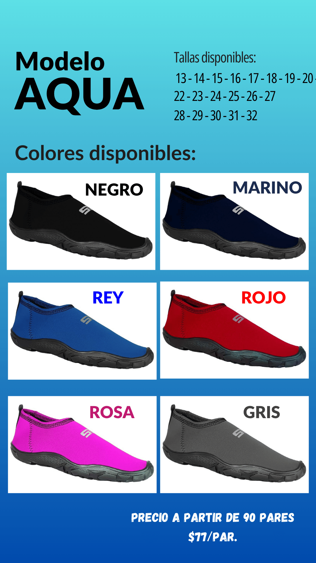 Zapato acuático modelo Aqua. Tallas 13 al 32, paquete de 90 pares.