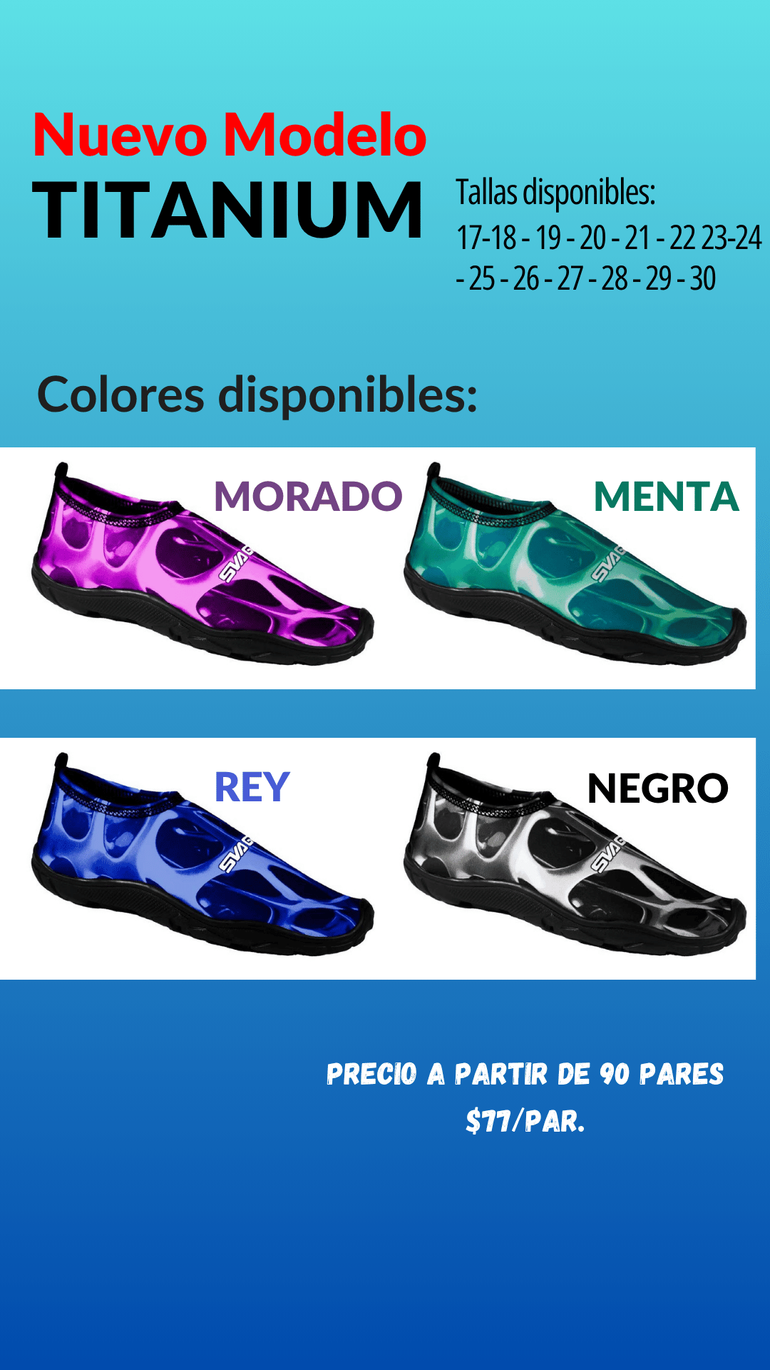 Zapato Acuático modelo Titanium. Tallas 17 al 30, paquete de 90 pares.
